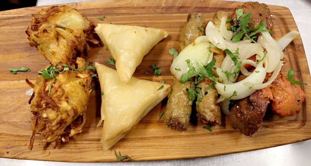 Meat Platter for 2 (L to R: Onion Bhaji, Meat Somosa, Shish Kebab, Chicken Tikka, Lamb Tikka)